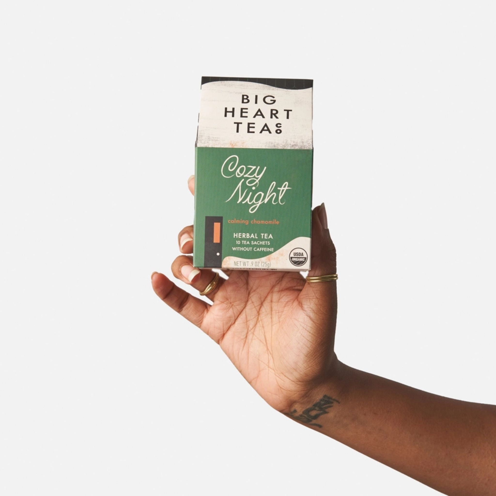 A calming blend of chamomile and mints. Cozy Night is naturally sweet and cuddly blend, the perfect bedtime story companion on cold, windy nights. INGREDIENTS: ORGANIC CHAMOMILE, ORGANIC SPEARMINT, ORGANIC LEMONGRASS. The bags are extra big to give the tea room to fully expand and breathe while it steeps. 10 compostable tea bags per unit unit dimensions 3"Wx2.75"Lx5.25"H.