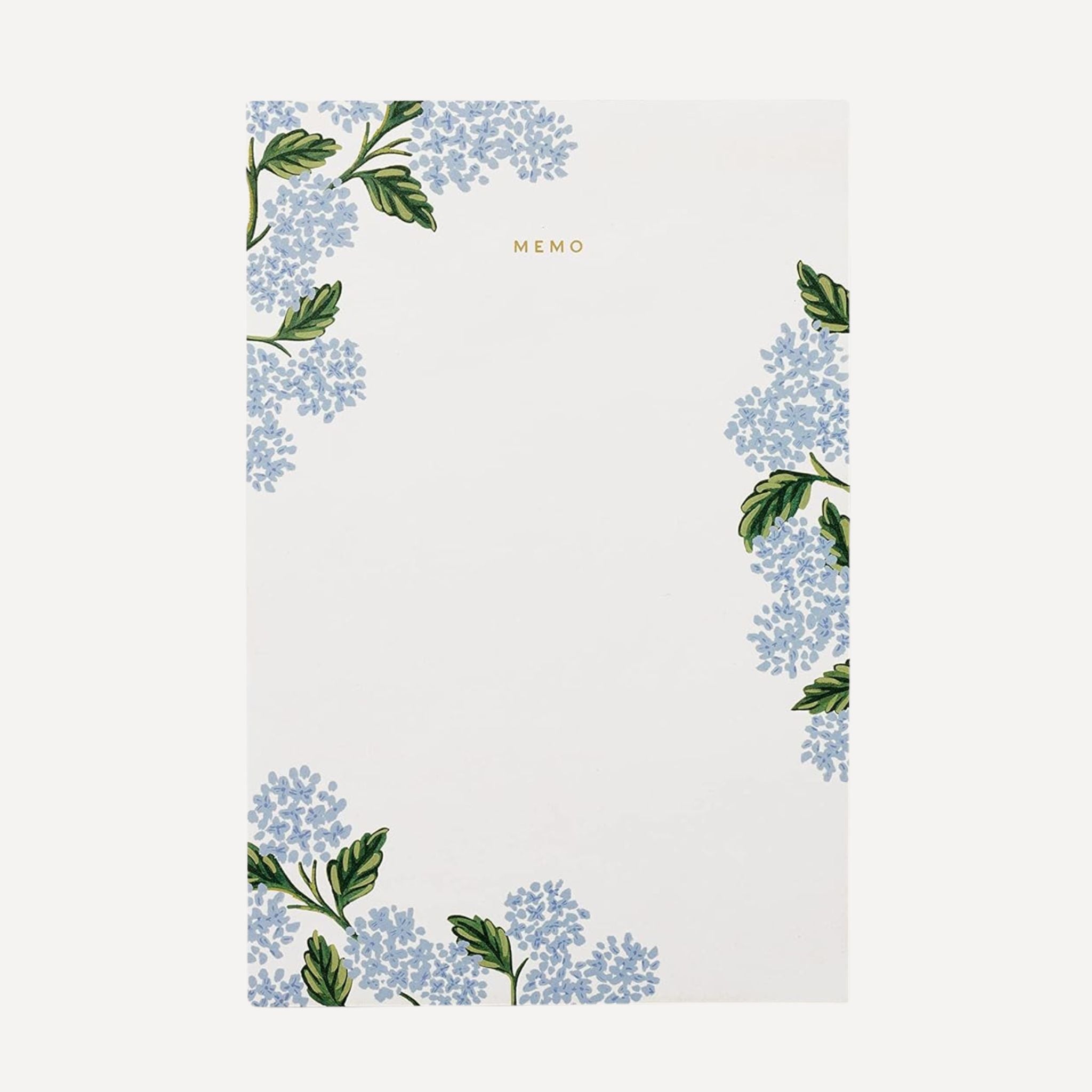 Graceful, blooming hydrangeas decorate this oversized notepad, which features 65 tear-off sheets and gold foil on every page. DETAILS - 9" L × 6" W - Warm white text paper - Printed in full color and foil stamped - Metallic gold foil - 65 tear-off pages.