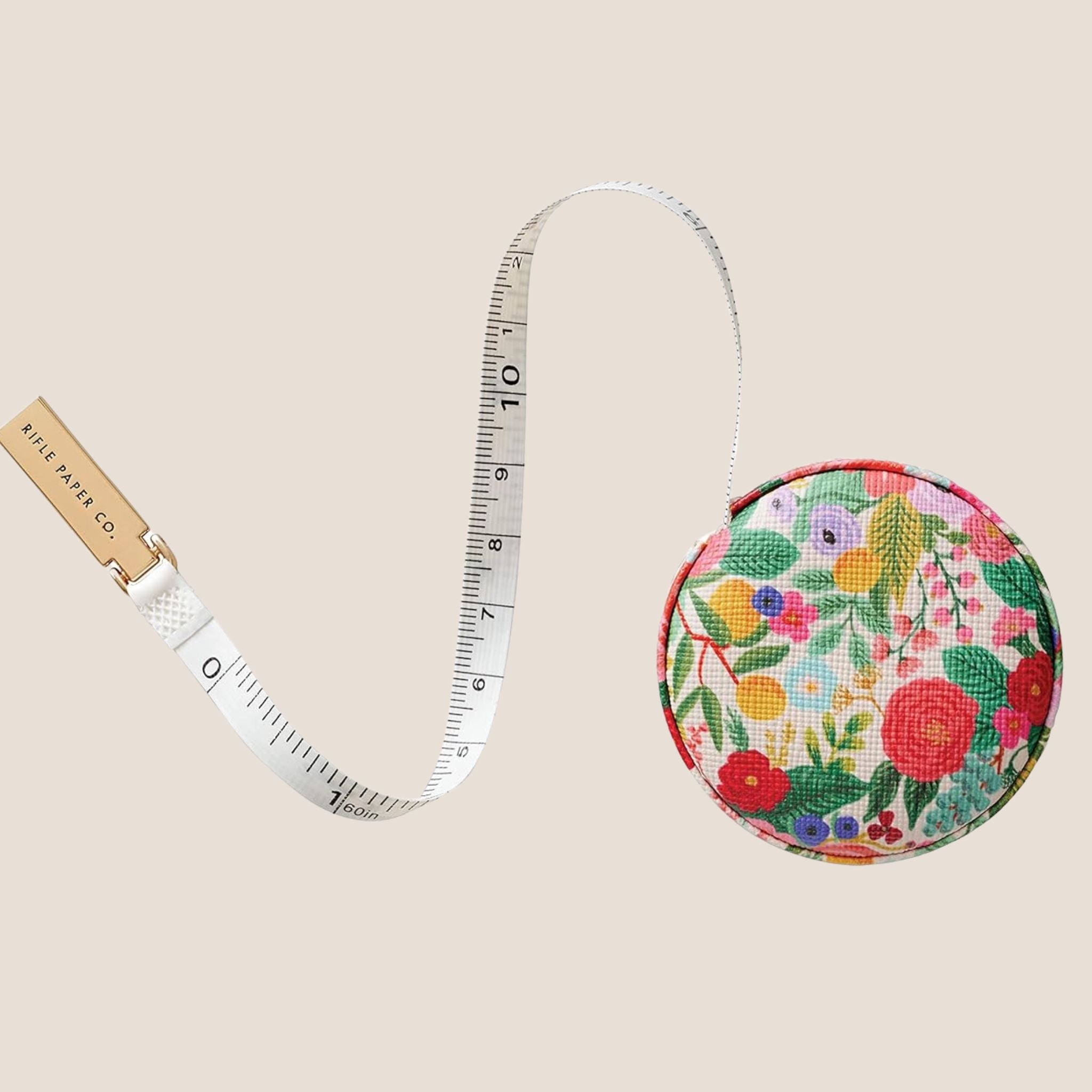 A perfect gift for someone who loves interior decorating. This retractable measuring tape is housed in an illustrated case with brass hardware and a hidden button release. Keep this handy tool in your sewing box, at your desk, or in your purse. The tape measures 60 inches or 152.4 centimeters. DETAILS - 2.25" L × 2.25" W - Textured PU with metal hardware - Printed in full color - 5 foot retractable tape - Wipe clean.