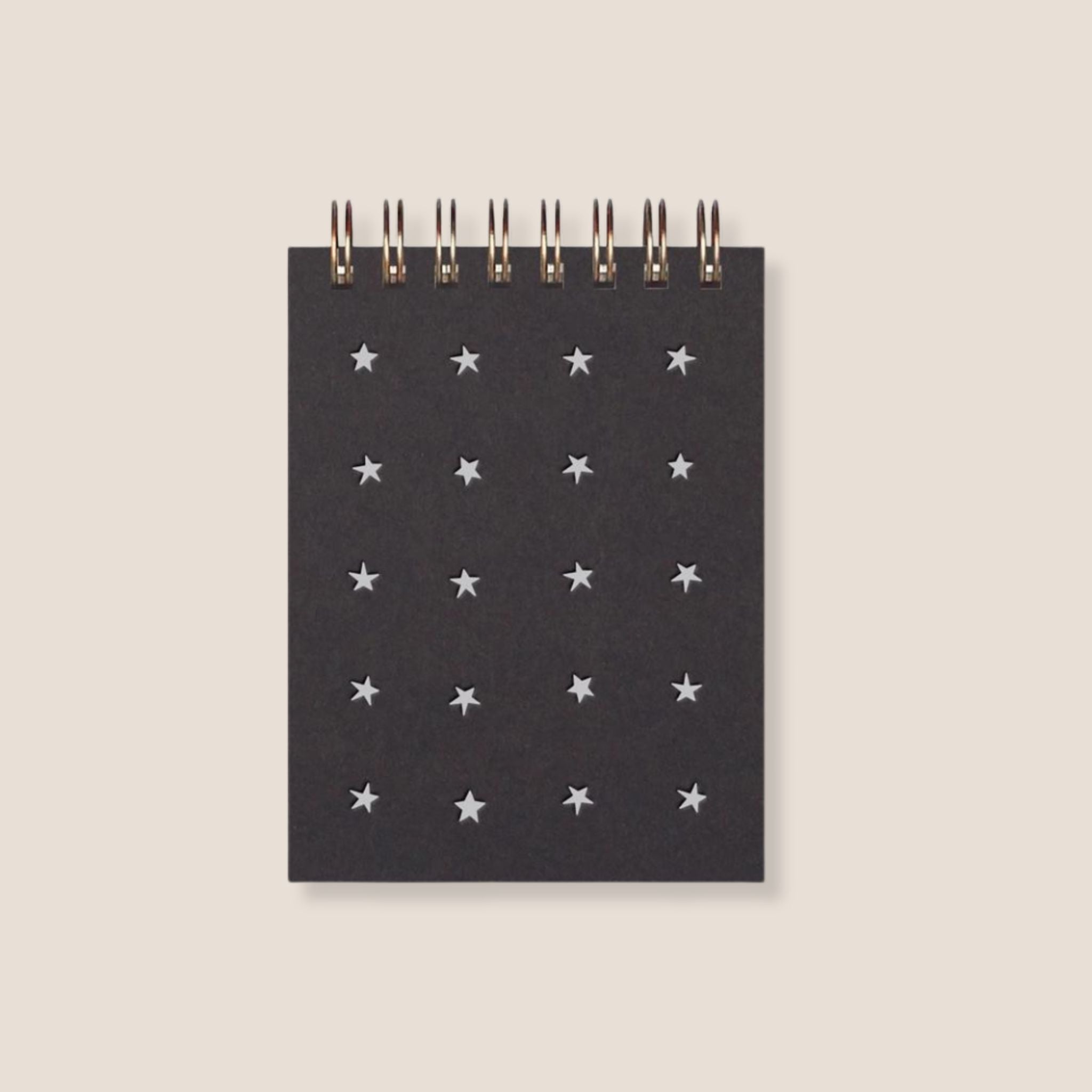 Don’t be afraid to shine with a star grid mini jotter notebook. This pocket notebook is a great journal to carry around when you need to jot down notes, dreams, or doodle ideas. Additional Details : -3”x4” -65 Unlined Interior Pages -Uncoated Vellum 70# Text Off-White Interior Paper -Bronze Wire-O Binding.
